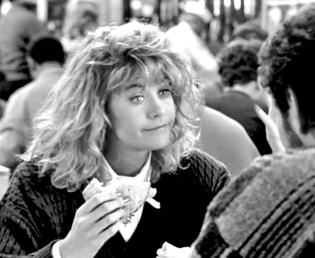 Pero, analicemos la escena y por qué es tan fascinante y divertida. Si alguien leyera en un guion que la protagonista finge un orgasmo en un lugar público, el peligro de que esa escena se convirtiera en un momento exhibicionista con cierto regusto sexista sería muy alto, y daría igual que fuera una comedia o no, sería una perfecta ocasión para exhibir a la actriz como objeto de escopofilia. Sin embargo, estamos ante una dirección y un guion que parecen dispuestos a que en esta ocasión esa circunstacia quede dada la vuelta. Por lo tanto, la puesta en escena no está sujeta a la erotización de la secuencia pues no tiene lugar en un restaurante a media luz, durante la cena, con vino y velas, tampoco Meg Ryan lleva un sugerente vestido que exponga su cuerpo a la mirada masculina, ni su actuación está pensada para seducir.