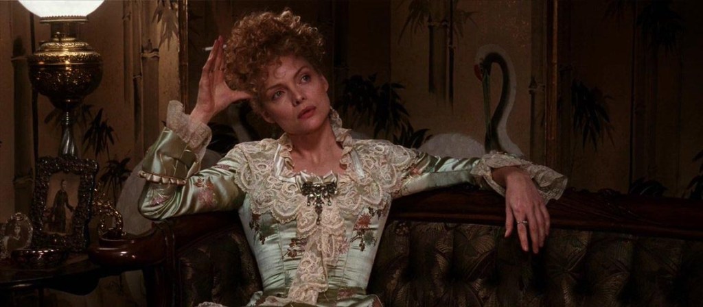 Dicho esto, es normal que Ellen Olenska (Michelle Pfeiffer) esté considerado su mejor personaje femenino, hay que tener en cuenta, además, que fue escrito por una mujer. Tanto en el libro como en la película, le personaje central es Newland Archer, sin embargo, en muchas ocasiones Archer es un mero observador de los efectos devastadores que la provinciana y conservadora sociedad de Nueva York ejercen sobre Ellen Olenska. La violencia de la que antes hablábamos se ceba brutalmente sobre este personaje. Olenska, que tras separarse de su marido, vuelve a Nueva York con su familia pensando que encontrará la paz y una vida tranquila, se ve sacudida por humillaciones y desprecios que le harán claudicar y volverse por donde vino. Ellen Olenska será criticada por no haber sido educada como corresponde, será ninguneada por no hacer las cosas como ellos las hacen y finalmente será desahuciada de su propio mundo. En este caso, como en tantos otros en el universo de Scorsese, la mujer queda a un lado y sufre las consecuencias de la sociedad en la que vive. La diferencia con otros personajes femeninos del director es que, en este caso, este papel lo escribió una mujer y por tanto tiene una mayor presencia, pero es tan víctima como el resto de mujeres que se pasean por la filmografía del cineasta.